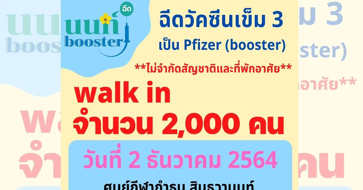 มาแล้ว สำหรับผู้ฉีดวัคซีนครบ 2 เข็ม “นนท์ booster” เปิดwalk-in ฉีดวัคซีน “ไฟเซอร์” จำนวน 2000 ราย ไม่จำกัดสัญชาติและที่พักอาศัย ตามเงื่อนไข