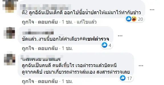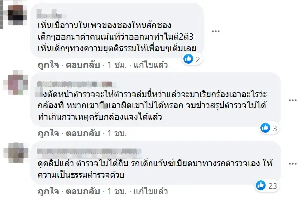 นอกจากนี้ยังได้มีชาวเน็ตหลายรายได้เข้ามาแสดงความคิดเห็นต่อคลิปเหตุการณ์ดังกล่าวโดยระบุข้อความว่า ว่าแล้ว จะถีบจะเบียดให้ตัวเองล้มเจ็บทำไม เป็นเราคงไม่ทำขนาดนั้นอะ ไม่คุ้ม แค่อาจจะตามจนเด็กหยุดเอง,ดูคลิปแล้ว ตำรวจไม่ได้ถีบ รถเด็กแว้นซ์เบียดมาทางรถตำรวจเอง ให้ความเป็นธรรมตำรวจด้วย
