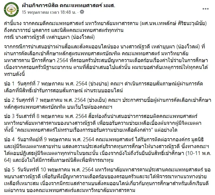 คณะแพทย์มมส. ยัน ไม่ให้ทุนน้องโวลต์เพิ่ม เนื่องจากเงินบริจาคมีจำนวนเพียงพอ แผนค่าใช้จ่ายทุนคณะกรรมการจะพิจารณาและให้ความเห็นชอบ