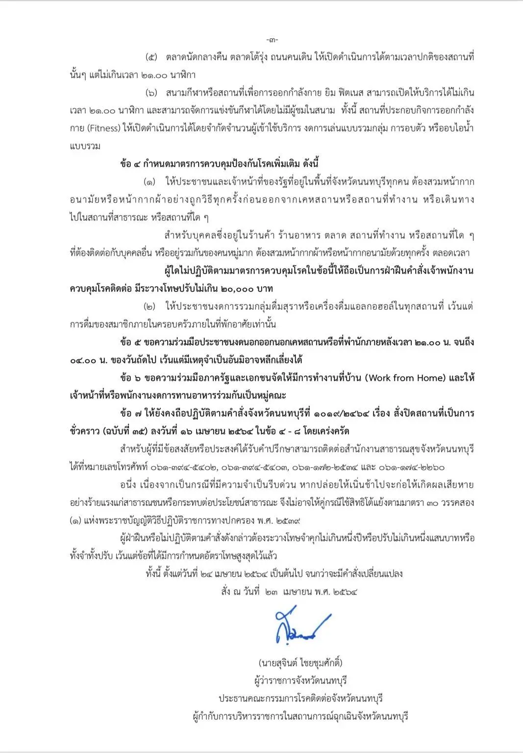 เฟสบุ๊ก ศูนย์ข้อมูล COVID-19 นนทบุรี ได้เผยแพร่ประกาศ คำสั่งจังหวัด นนทบุรี ที่ 1121/2564 ลงวันที่ 23 เมษายน 2564 เรื่องสั่งปิดสถานที่เป็นการชั่วคราว (ฉบับที่ 37) โดยคำสั่งดังกล่าวจะมีผลตั้งแต่วันที่ 24 เมษายน 2564 จนกว่าจะมีคำสั่งเปลี่ยนแปลง