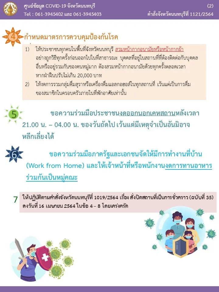ขอความร่วมมือประชาชนงดออกนอกเคหสถานหลังเวลา 21.00-04.00 น. ของวันถัดไป และขอความร่วมมือภาครัฐและเอกชนจัดให้มีการทำงานที่บ้าน (Work from Home) และให้เจ้าหน้าที่หรือพนักงาน “งด” ทานอาหารร่วมกันเป็นหมู่คณะ