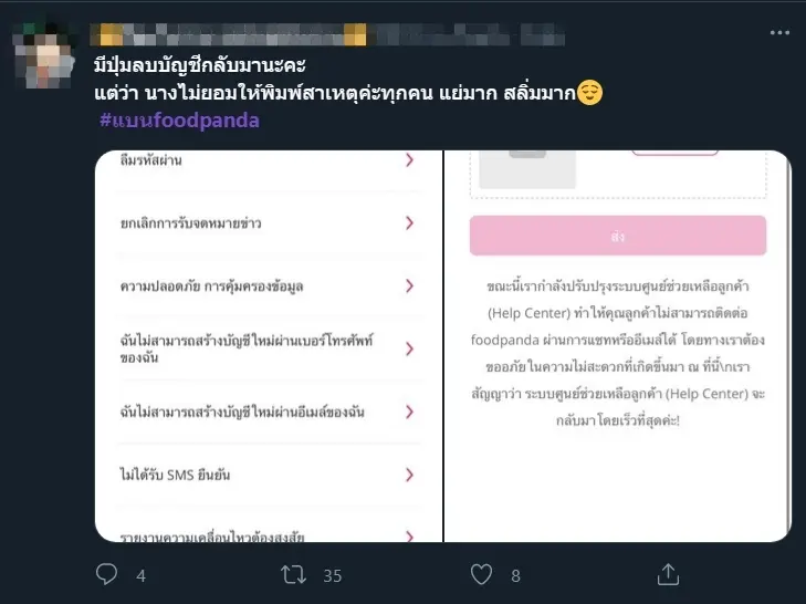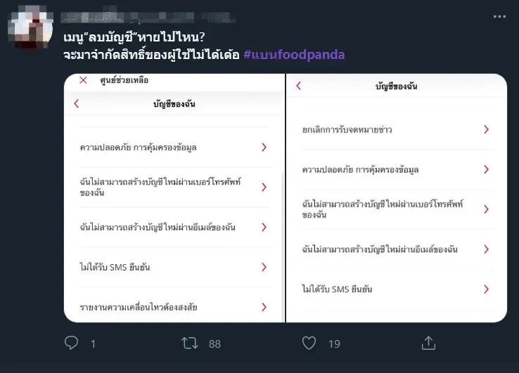 อีกทั้งหลังจากที่มีผู้ใช้หลายรายพยายามที่จะลบบัญชีแต่ฟังก์ชั่นในการลบออกหายไปทางฟู้ดแพนด้าจึงได้ออกมาชี้แจงโดยระบุว่า “ทางเราต้องขอภัย เนื่องจากเกิดข้อผิดพลาดทางระบบจึงทำให้ปุ่มลบบัญชีหายไปในแอปพลิเคชันค่ะ” ทำให้ผู้ใช้หลายรายเกิดความไม่พอใจ ต่อมาไม่นาน foodpanda ก็ได้นำฟังก์ชั่นลบบัญชีผู้ใช้กลับมาอีกครั้ง
