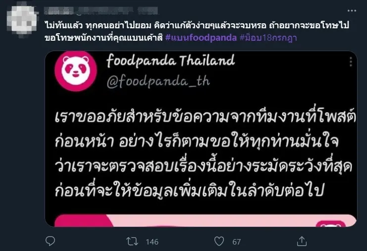 หลังจากนั้นไม่นาน @foodpanda_th ก็ได้ออกมาทวิตข้อความขอโทษต่อเหตุการณ์ดังกล่าวโดยระบุว่า “เราขออภัยสำหรับข้อความจากทีมงานที่โพสต์ก่อนหน้า เรายังคงตรวจสอบเหตุการณ์ที่เกิดขึ้นในวันนี้ เราขออภัยอย่างสูงสำหรับการตอบกลับคอมเมนต์และการตัดสินอย่างไม่ละเอียดถี่ถ้วนที่เกิดขึ้นก่อนหน้านี้ ในขณะที่ทีมงานยังคงตรวจสอบข้อเท็จจริงของสิ่งที่เกิดขึ้น