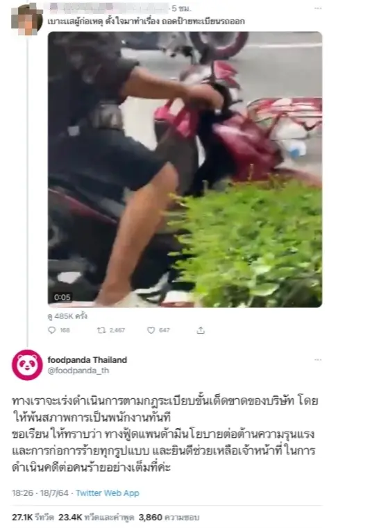 ต่อมาทวิตเตอร์ของ @foodpanda_th ตอบกลับข้อความดังข้างต้น โดยระบุว่า “ทางเราจะเร่งดำเนินการตามกฎระเบียบขั้นเด็ดขาดของบริษัท โดยให้พ้นสภาพการเป็นพนักงานทันที ขอเรียนให้ทราบว่าทางฟู้ดแพนด้ามีนโยบายต่อต้านความรุนแรงและการก่อการร้ายทุกรูปแบบ และยินดีช่วยเหลือเจ้าหน้าที่ในการดำเนินคดีต่อคนร้ายอย่างเต็มที่ค่ะ” ก่อนที่จะลบหายไปหลังจากเกิดกระแสตีกลับ