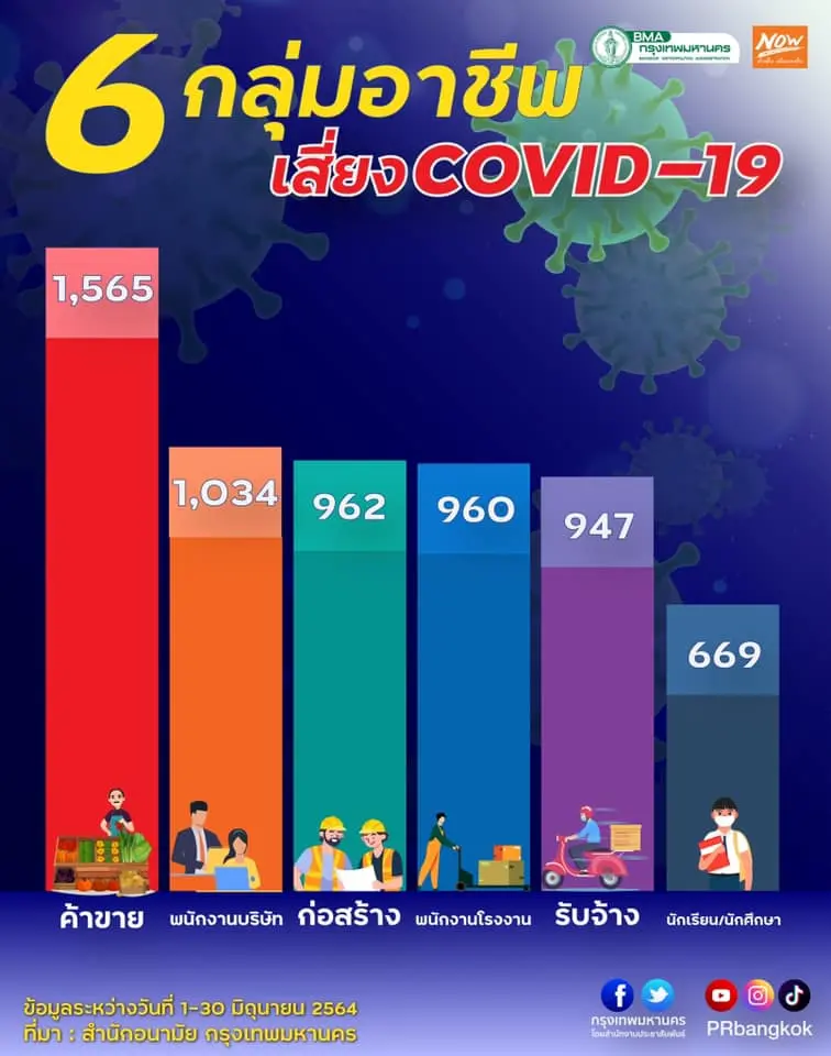 เมื่อวันที่ 6 กรกฎาคม 2564 ที่ผ่านมา เฟซบุ๊กเพจ กรุงเทพมหานคร โดยสำนักงานประชาสัมพันธ์ ได้เปิดเผยถึง 6 กลุ่มอาชีพที่มีความติดเชื้อโควิดสูง โดยในที่ประชุมศูนย์บริหารสถานการณ์การแพร่ระบาดของโรคติดเชื้อไวรัส 2019 กรุงเทพมหานคร (ศบค.กทม.) ระบุว่าจากข้อมูลการสอบสวนโรคผู้ป่วยติดเชื้อโควิด-19 โดยสำนักอนามัย กทม. ระหว่างวันที่ 1-30 มิ.ย.64 พบว่า กลุ่มอาชีพของผู้ป่วยโควิด-19 ที่พบมากที่สุดคือ ค้าขาย , พนักงานบริษัท , ก่อสร้าง , พนักงานโรงงาง , รับจ้าง ตามลำดับ