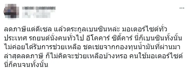 ลดภาษีแต่ดีเซล แล้วตระกูลเบนซินหล่ะ มอเตอร์ไซต์ทั่วประเทศ รถยนต์นั่งคนทั่วไป อีโคคาร์ ซิตี้คาร์ นี่ก็เบนซินทั้งนั้น ไม่ค่อยได้รับการช่วยเหลือ ชดเชยจากกองทุนน้ำมันที่ผ่านมา ล่าสุดลดภาษี ก็ไม่คิดจะช่วยเหลือบ้างหรอ คนใช้มอเตอร์ไซต์นี่ก็คนจนทั้งนั้น
