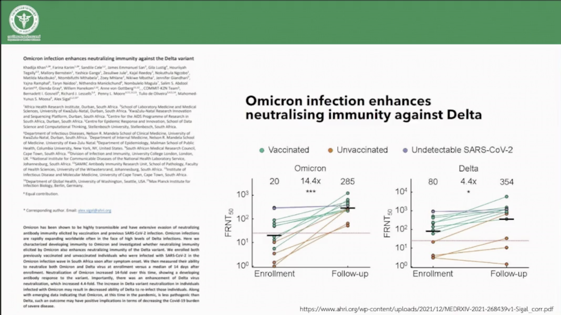 ทางด้านของนายแพทย์ศุภกิจ ศิริลักษณ์ อธิบดีกรมวิทยาศาสตร์การแพทย์ ได้เผยถึงข้อมูลที่น่าสนใจเกี่ยวกับเชื้อโควิดโอมิครอน โดยเป็นข้อมูลจากการศึกษาในทวิปแอฟริการใต้ ซึ่งทำการเจาะเลือดของผู้ที่ติดเชื้อโอมิครอนแล้ว 14 วัน ทั้งในกลุ่มของผู้ติดเชื้อที่ฉีดวัคซีน และไม่ฉีดวัคซีน โดยนำมาวัคค่าภูมิและความสามารถในการจัดการเชื้อโอมิครอนและเชื้อเดลต้าได้มากน้อนแค่ไหน
