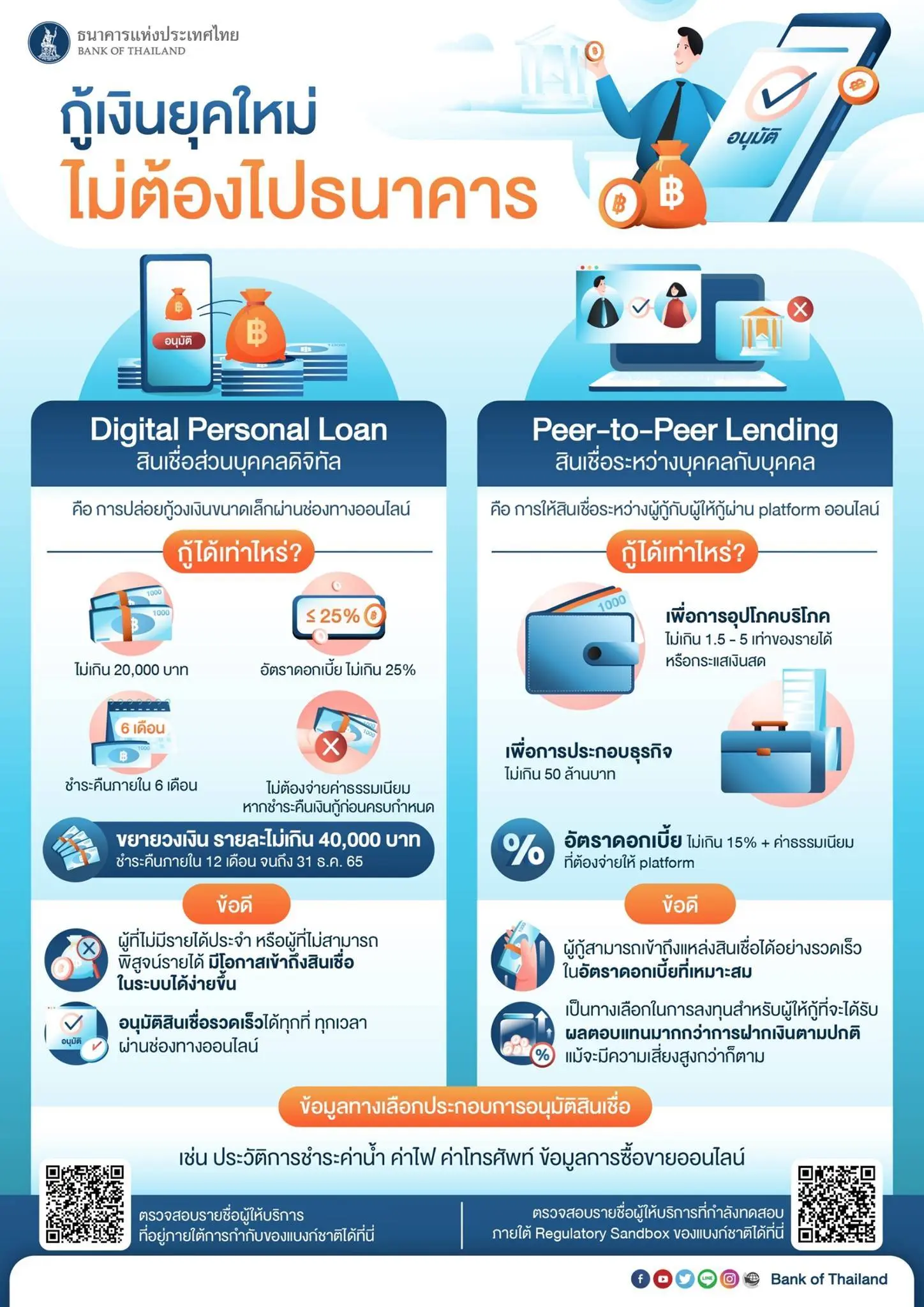 สินเชื่อออนไลน์ — เมื่อวันที่ 10 ธ.ค. 2564 เฟซบุ๊กธนาคารแห่งประเทศไทยได้รวบรวมรายชื่อบริษัทผู้ให้บริการสินเชื่อส่วนบุคคลดิจิทัลที่อยู่ภายใต้การกำกับของธนาคารแห่งประเทศไทย โดยได้แบ่งสินเชื่อส่วนบุคคลยุคใหม่ ออกเป็น 1.สินเชื่อส่วนบุคคลดิจิทัล และ 2.สินเชื่อระหว่างบุคคลกับบุคคล