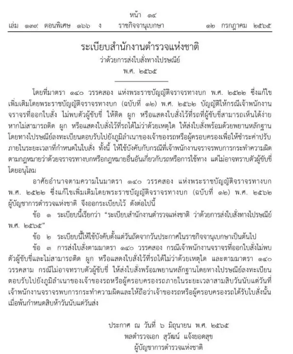 โดยเว็บไซต์ราชกิจจานุเบกษา เผยแพร่ประกาศ วันที่ 12 ก.ค.2565 ระเบียบสำนักงานตำรวจแห่งชาติ ว่าด้วยการส่งใบสั่งทางไปรษณีย์ พ.ศ. 2565 อาศัยอำนาจตามความในมาตรา 140 วรรคสอง แห่งพระราชบัญญัติจราจรทางบก พ.ศ. 2522 ซึ่งแก้ไขเพิ่มเติมโดยพระราชบัญญัติจราจรทางบก (ฉบับที่ 12) พ.ศ. 2562 ผู้บัญชาการตำรวจแห่งชาติ จึงออกระเบียบไว้ ดังต่อไปนี้