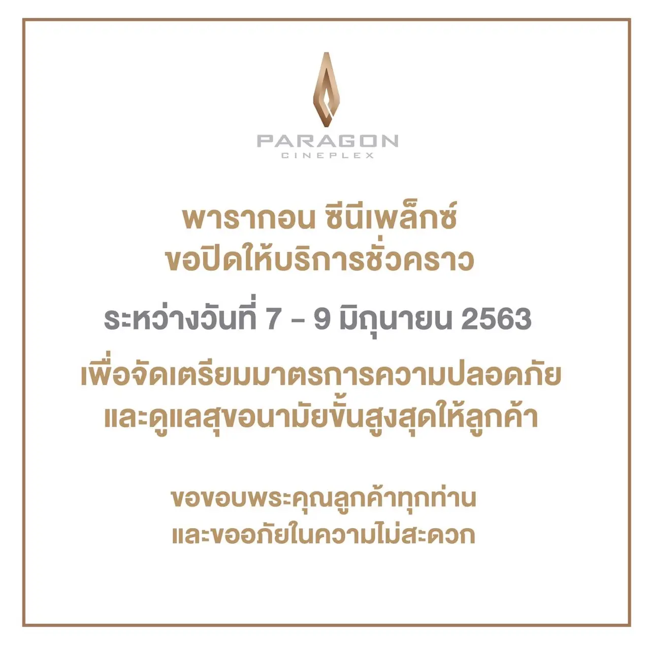 ทั้งนี้ โรงภาพยนตร์พารากอน ซีนีเพล็กซ์ ขออภัยมาในความไม่สะดวก ณ ที่นี้ และขออภัย พร้อมยืนยันให้ความร่วมมือกับภาครัฐในมาตราการความปลอดภัยป้องกันโควิด19 และ จะระมัดระวังไม่ให้เกิดเหตุการณ์เช่นนี้ขึ้นอีก เพื่อความปลอดภัยของลูกค้า