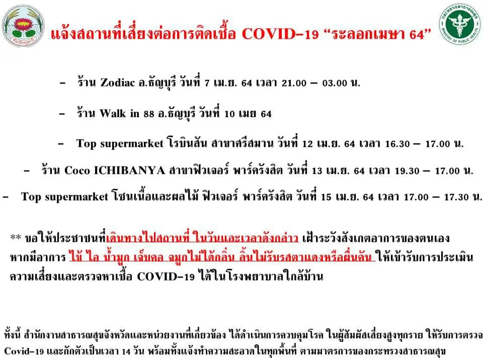 ขณะเดียวกันสำนักงานสาธารณสุขจังหวัดปทุมธานียังได้เปิดเผย5 สถานที่เสี่ยงต่อการแพร่เชื้อโควิด 19 ในช่วงเดือนเม.ย.64 ซึ่งมีดังต่อไป