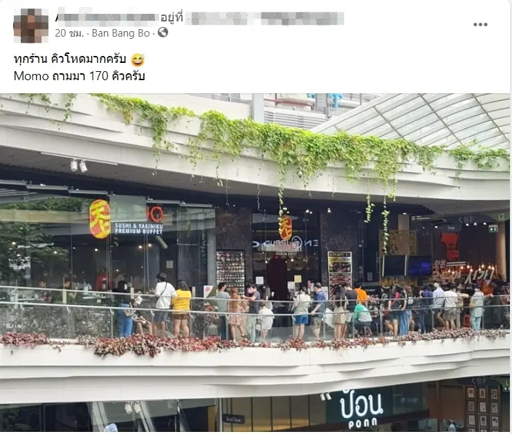โดยเมื่อวันที่ 11 กันยายน ที่ผ่านมา มีสมาชิกของกลุ่มเฟซบุ๊กชื่อว่า กลุ่มคนรักบุฟเฟต์ (Buffet Lovers) ได้แชร์ภาพบรรยากาศของการต่อแถวรอคิวเข้ารับประทานชาบูที่ห้างสรรพสินค้าแห่งหนึ่ง ซึ่งเจ้าของโพสต์ได้ระบุข้อความเอาไว้ว่า “ทุกร้าน คิวโหดมากครับ ….. ถามมา 170 คิวครับ”