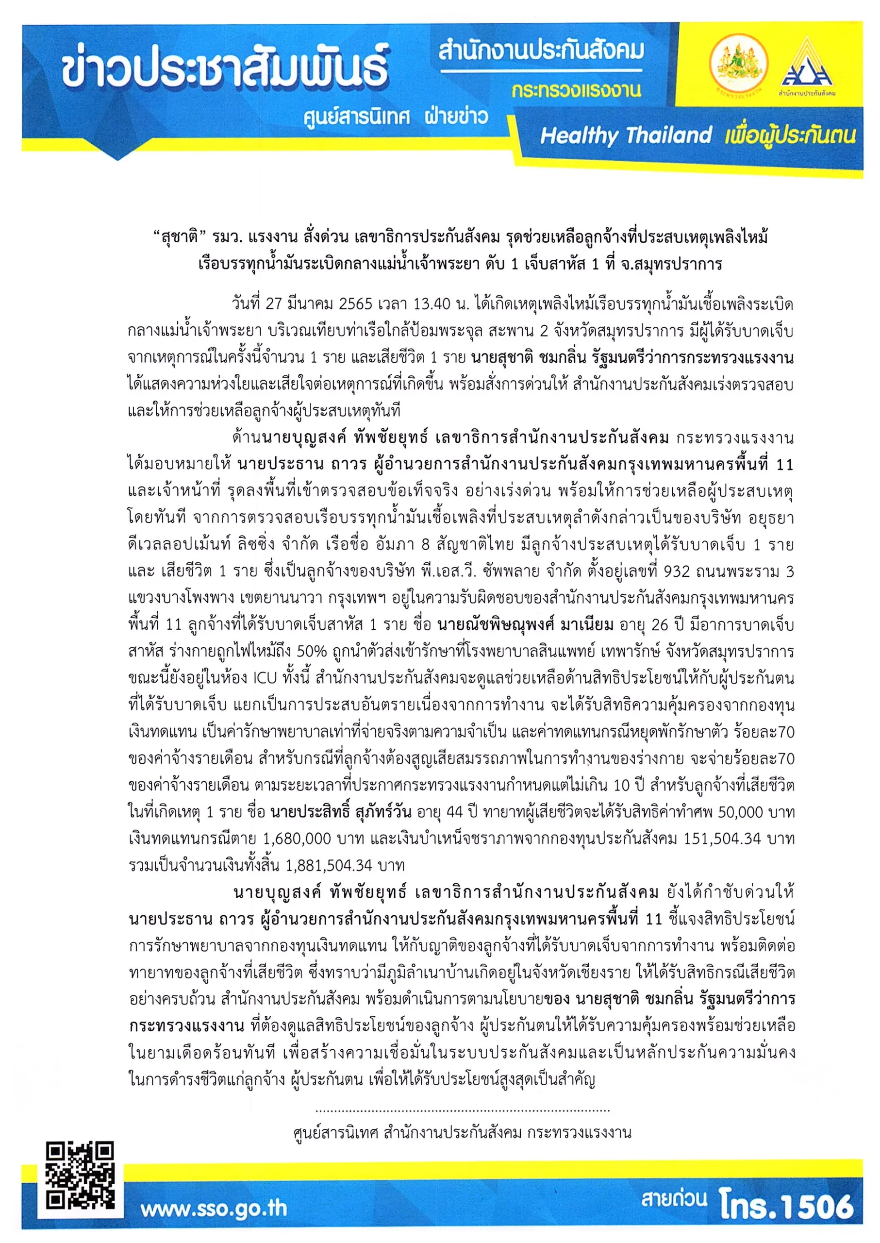 วันที่ 27 มีนาคม 2565 เวลา 13.40 น. ได้เกิดเหตุเพลิงไหม้เรือบรรทุกน้ำมันเชื้อเพลิงระเบิดกลางแม่น้ำเจ้าพระยา บริเวณเทียบท่าเรือใกล้ป้อมพระจุล สะพาน 2 จังหวัดสมุทรปราการ มีผู้ได้รับบาดเจ็บจากเหตุการณ์ในครั้งนี้จำนวน 1 ราย และเสียชีวิต 1 ราย นายสุชาติ ชมกลิ่น รัฐมนตรีว่าการกระทรวงแรงงาน ได้แสดงความห่วงใยและเสียใจต่อเหตุการณ์ที่เกิดขึ้น พร้อมสั่งการด่วนให้ สำนักงานประกันสังคมเร่งตรวจสอบ และให้การช่วยเหลือลูกจ้างผู้ประสบเหตุทันที