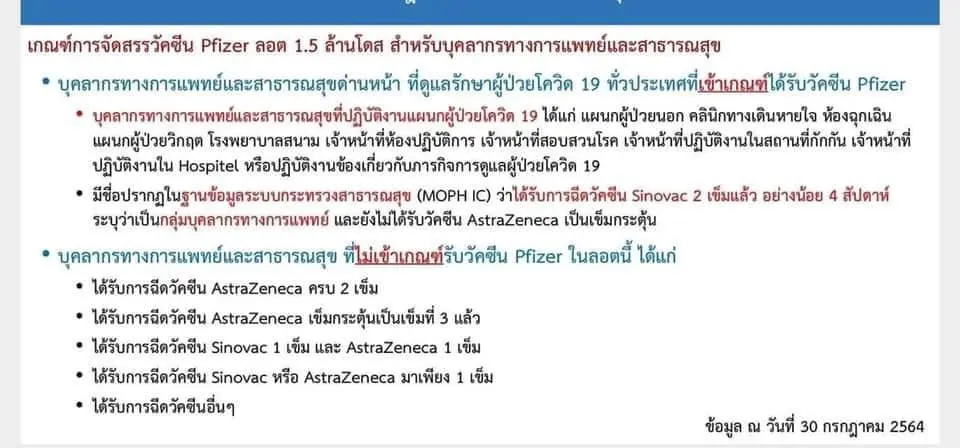 เมื่อวันที่ 30 ก.ค.2564 กรมควบคุมโรคเปิดเผยมติการประชุมคณะทำงานด้านบริหารการจัดการการให้บริการ วัคซีนไฟเซอร์ โดยได้มีการระบุถึงเกณฑ์การจัดสรรวัคซีนไฟเซอร์ จำนวน 1.5 ล้านโดส สำหรับบุคลากรทางการแพทย์และสาธารณสุข ซึ่งมีรายละเอียดดังนี้