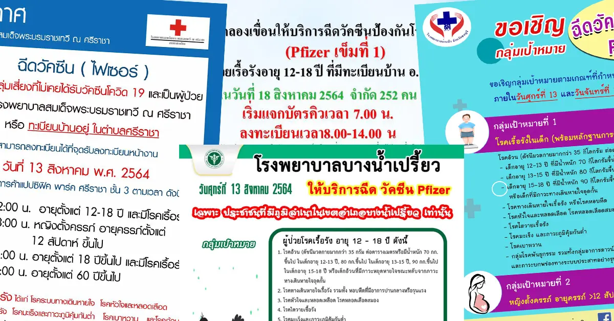 โรงพยาบาลในต่างจังหวัดหลายแห่ง เริ่มเปิดให้บริการ ‘ฉีดวัคซีนไฟเซอร์’ ให้แก่ปชช. กลุ่มเสี่ยง อายุตั้งแต่ 12-18 ปี และมีโรคเรื้อรัง ที่มีทะเบียนบ้านอยู่ในตำบลนั้น ๆ แล้ว
