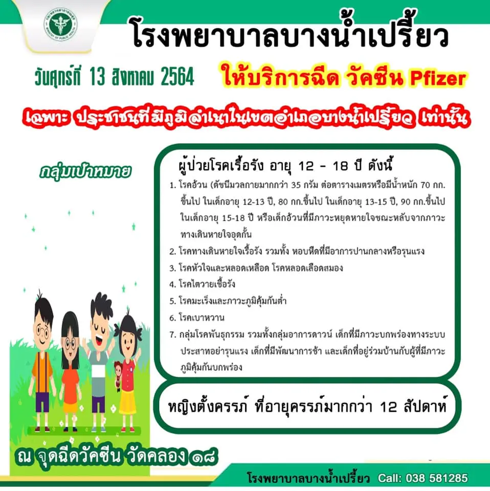 โรงพยาบาลบางน้ำเปรี้ยว จะฉีดวัคซีน Pfizer ให้กับประชาชนที่มีอายุ 12 – 18 ปี ที่มีภูมิลำเนาอยู่ในอำเภอบางน้ำเปรี้ยว ในวันที่ 13 สิงหาคม 2564