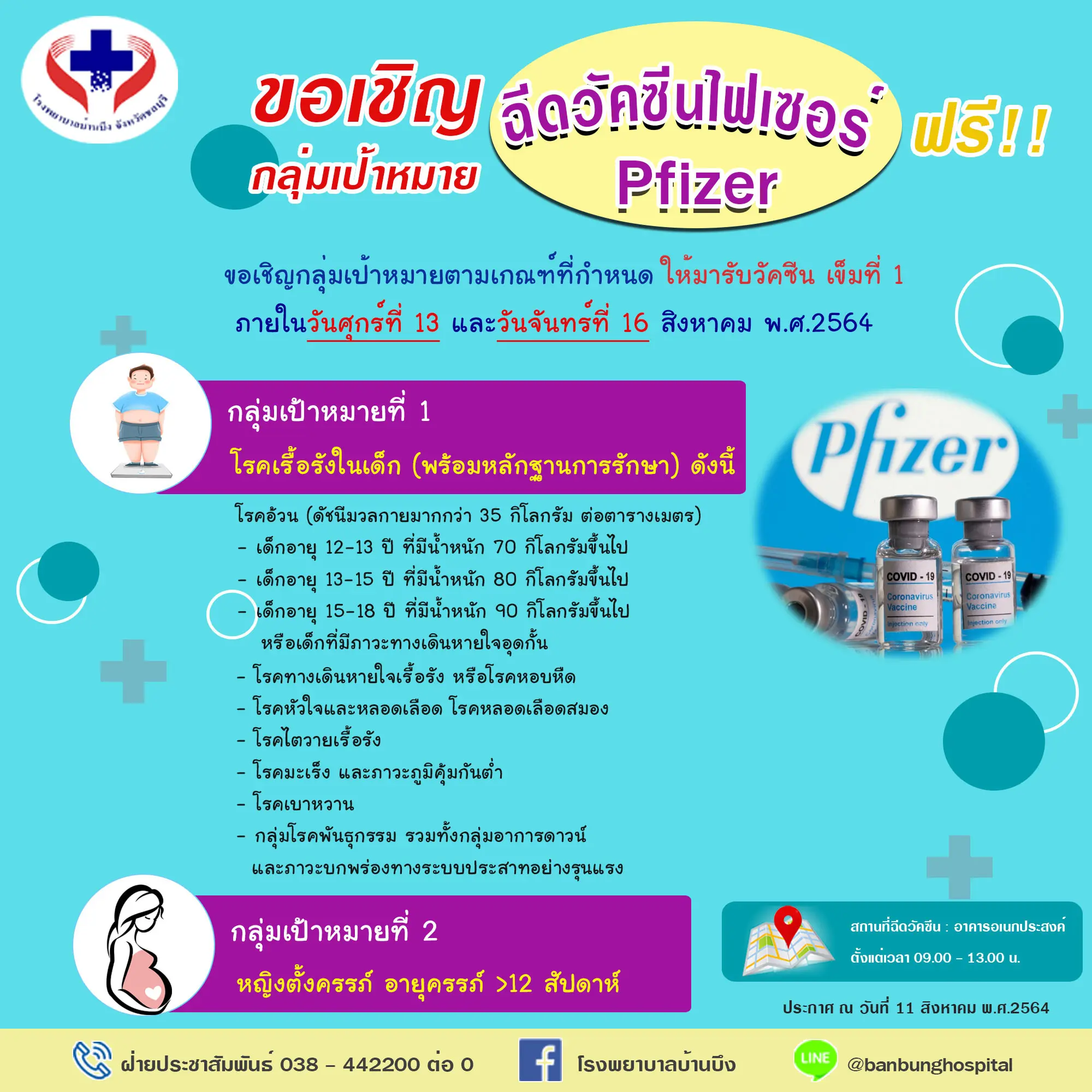 รพ.บ้านบึงเปิดให้บริการฉีดวัคซีนป้องกันโรคโควิด-19 (Pfizer เข็มที่ 1) สำหรับผู้ป่วยโรคเริ้อรัง ที่มีทะเบียนบ้าน อ.บ้านบึงเท่านั้น