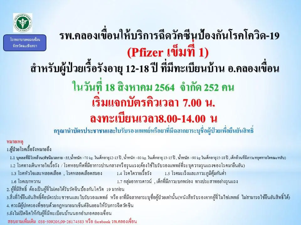 รพ.คลองเขื่อนให้บริการฉีดวัคซีนป้องกันโรคโควิด-19 (Pfizer เข็มที่ 1) สำหรับผู้ป่วยโรคเริ้อรัง อายุ 12-18 ปี ที่มีทะเบียนบ้าน อ.คลองเขื่อน