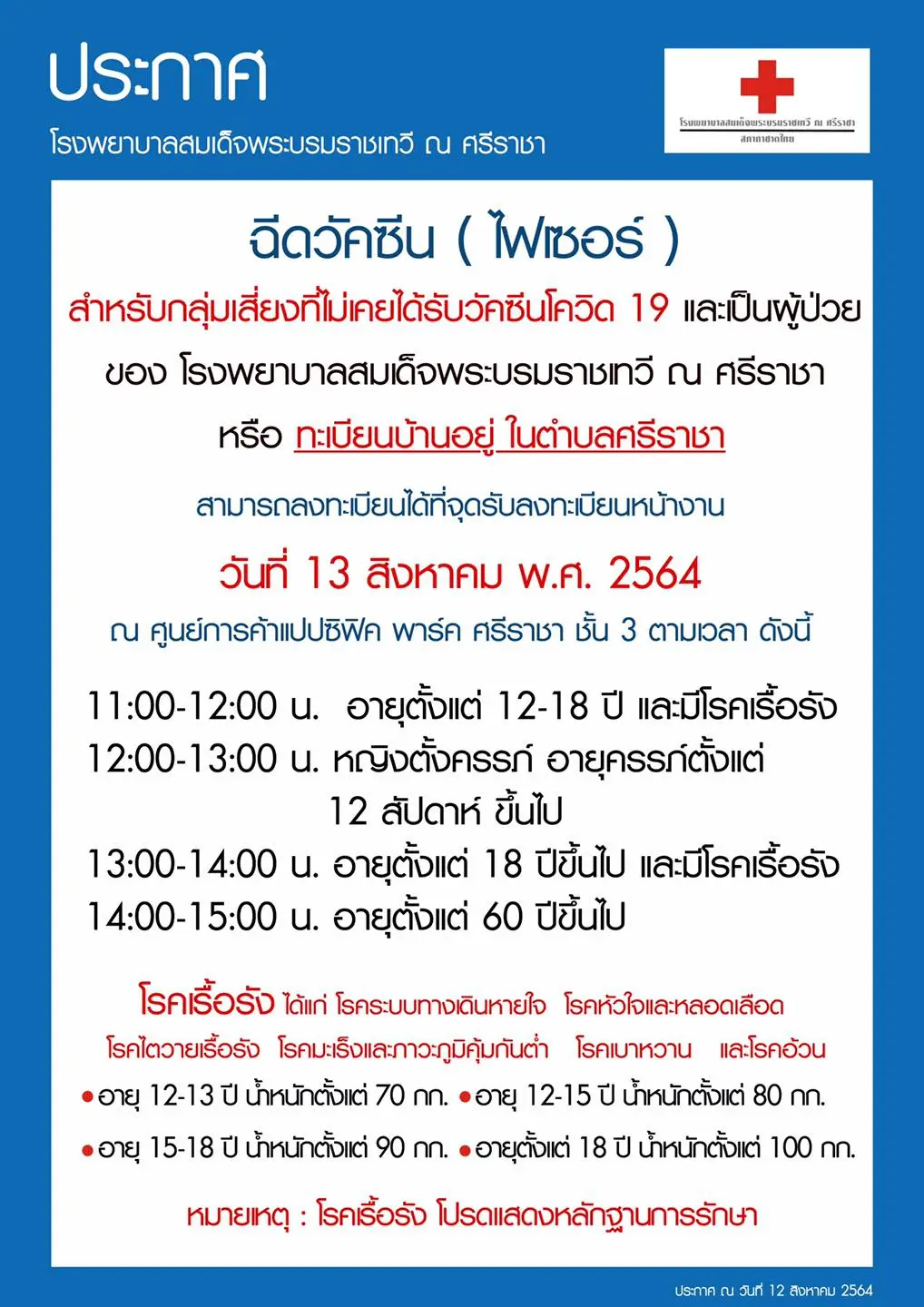 โรงพยาบาลสมเด็จฯ ณ ศรีราชา ฉีดวัคซีน Pfizer (ไฟเซอร์) สำหรับกลุ่มเสี่ยงที่ไม่เคยได้รับวัคซีน และเป็นผู้ป่วยของโรงพยาบาลสมเด็จพระบรมราชเทวี ณ ศรีราชา หรือ ทะเบียนบ้านอยู่ในตำบลศรีราชา