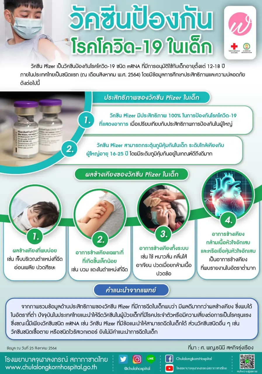 เมื่อวันที่ 25 สิงหาคม 2564 เพจเฟซบุ๊ก โรงพยาบาลจุฬาลงกรณ์ สภากาชาดไทย ได้เปิดเผยข้อมูลเกี่ยวกับวัคซีนป้องกันโรคโควิด-19 ในเด็ก ชนิด mRNA หรือไฟเซอร์ โดยระบุว่า
