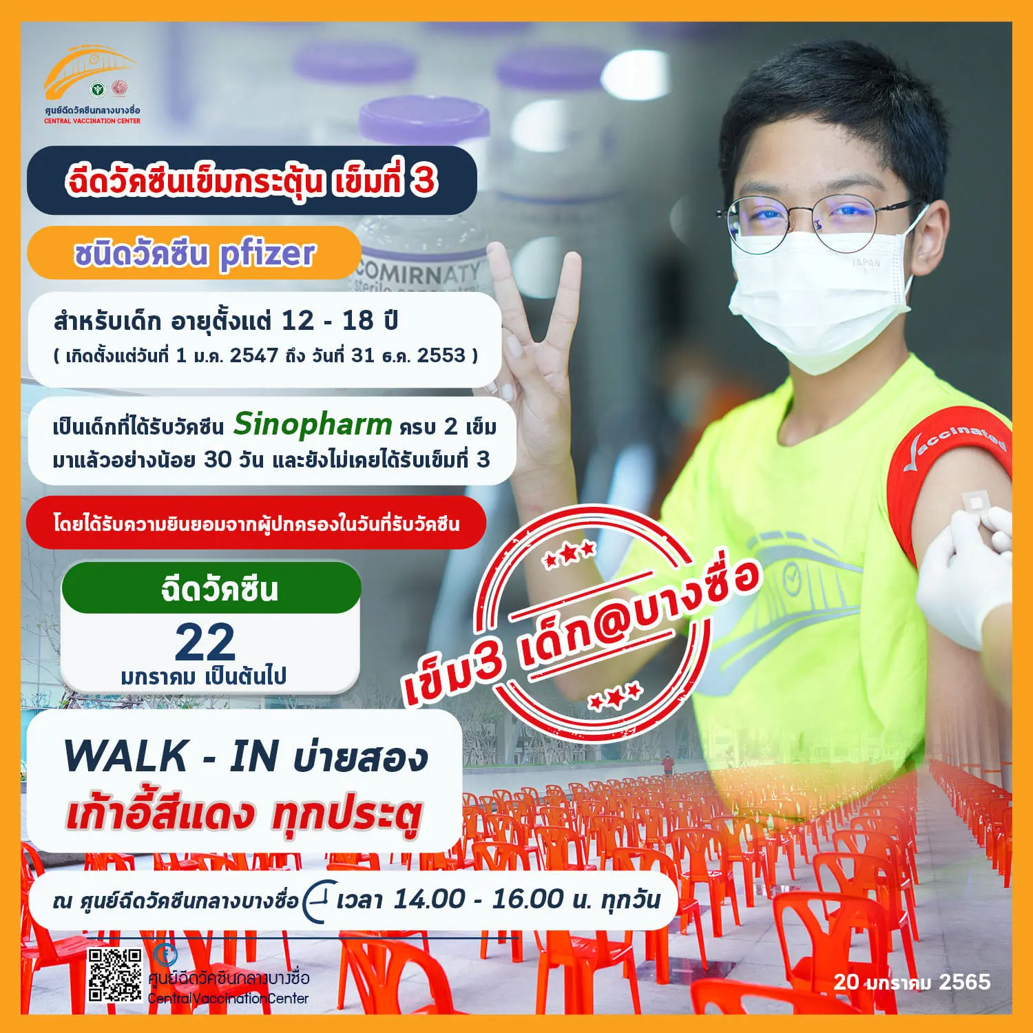 สำหรับเด็ก อายุตั้งแต่ 12 – 18 ปี (เกิดตั้งแต่วันที่ 1 มกราคม 2547 ถึง วันที่ 31 ธ.ค. 2553) ที่เคยได้รับวัคซีนซิโนฟาร์ม (Sinopharm) จากทุกศูนย์ฉีดอื่นๆ ครบแล้ว 2 เข็ม โดยรับเข็มที่ 2 มาแล้วอย่างน้อย 30 วัน และไม่เคยได้รับเข็มที่ 3 มาก่อน