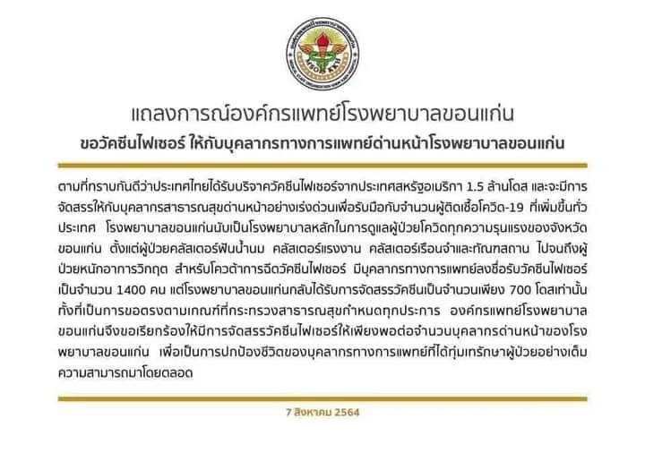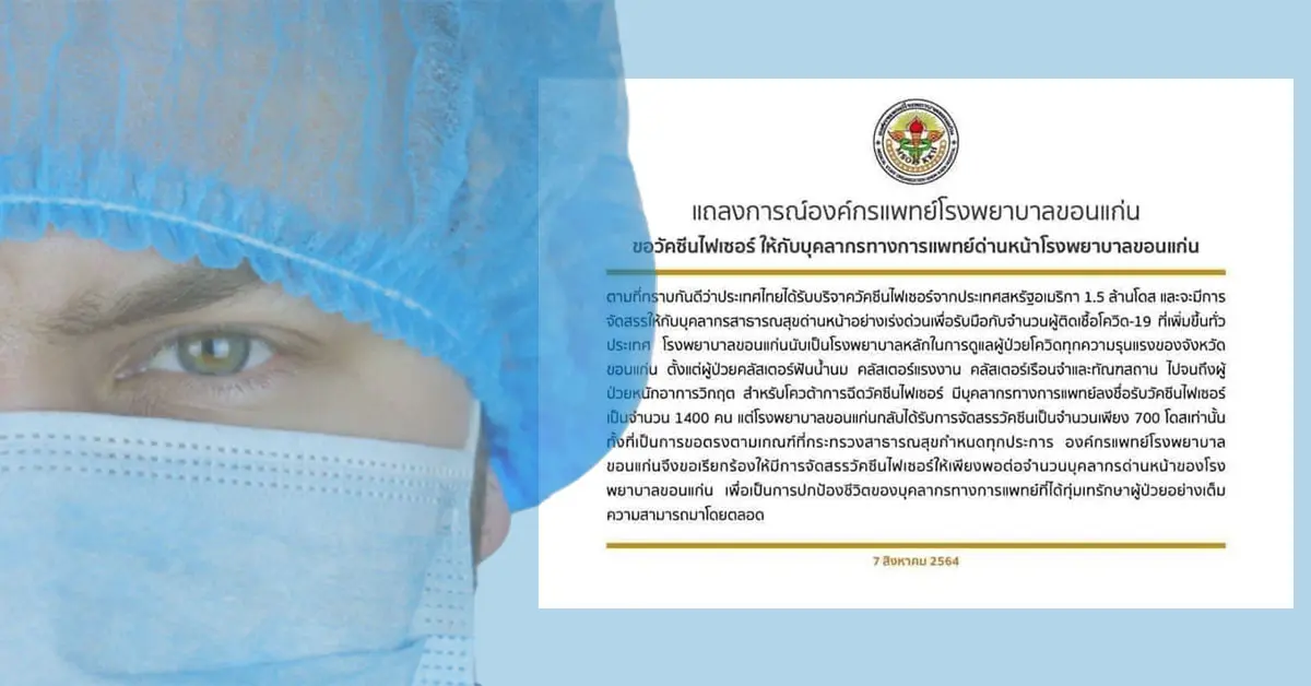 ไม่เห็นที่คุยกันไว้! องค์กรแพทย์ รพ.ขอนแก่น ออกแถลง ทวนวัคซีน “ไฟเซอร์” ให้บุคลากรหน้าด่าน จำนวน 1,400 คน กลับได้รับแค่ 700 โดส