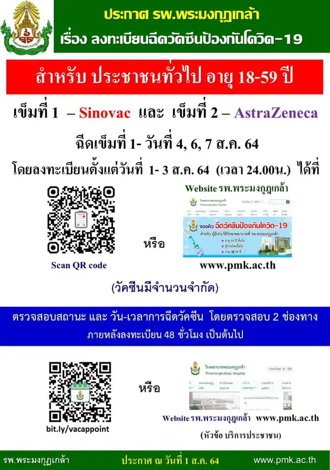 ทั้งนี้ทางโรงพยาบาลจะเริ่มฉีดวัคซันเข็มที่ 1 ตั้งแต่วันที่ 4 ถึงวันที่ 7 สิงหาคม 2564 ผู้ที่ลงทะเบียนแล้ว สามารถตรวจสอบสถานะและวันเวลาในการเข้ารับวัคซีนสามารถ ผ่เช็กได้ทางเว็บไซต์ www.pmk.ac.th (หัวข้อบริการประชาชน) หรือ scan QR code อย่างไรก็ตามวัคซีนให้บริการมีจำนวนจำกัด