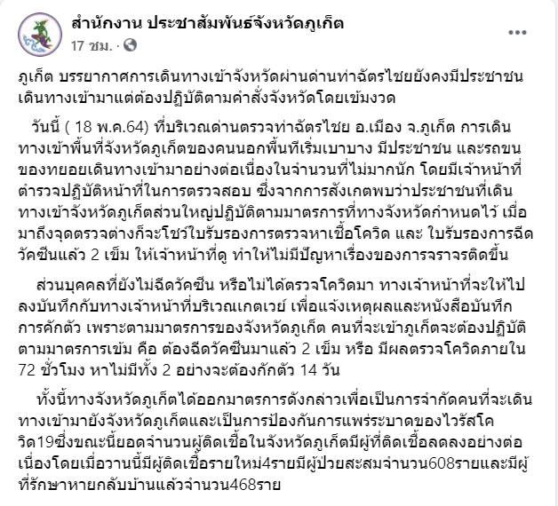 ทั้งนี้ผู้ที่เดินทางเข้าจังหวัดภูเก็ต โดยไม่มีการฉีดวัคซีนครบทั้งสองโดส หรือ ไม่มีเอกสารผลตรวจโรค จะต้องเเดินทางเข้าจังหวัดผ่านทางด่านท่าฉัตรไชย ภายในเวลา 08.30-20.30 น.เท่านั้น เพราะเป็นเวลาที่มีเจ้าหน้าที่ปฏิบัติงาน ส่วนเวลา 23.00-05.00 น. ด่านท่าฉัตรไชย ยังคงห้ามบุคคลอื่นเข้าจังหวัด ยกเว้นรถที่ได้รับการยกเว้นตามคำสั่งจังหวัด