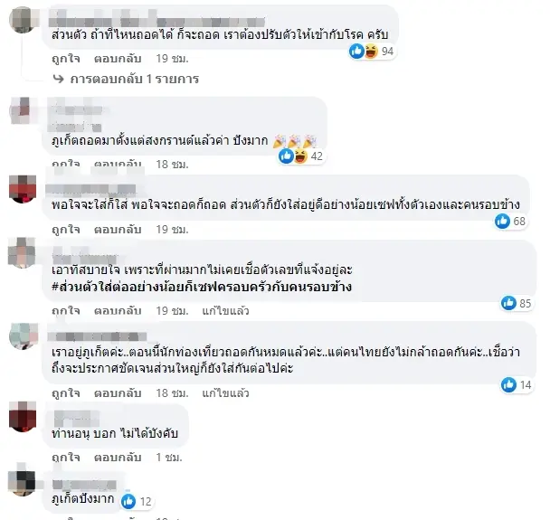 รวมถึงบางความคิดเห็นก็บอกว่า ปกติบริเวณชายหาดก็ไม่สวมหน้ากากอนามัยกัน โดยคนไทยส่วนมากก็ยังใส่อยู่ แต่นักท่องเที่ยว ถอดกันหมดแล้ว เป็นต้น