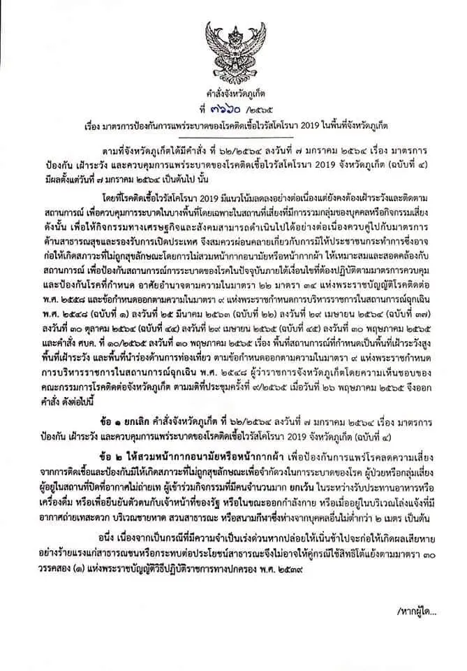 ตามที่จังหวัดภูเก็ต อนุญาตให้มีการถอดหน้ากากอนามัย โดยเริ่มมีผลตั้งแต่วันที่ 1 มิ.ย.65 เป็นต้นไป ภายใต้มาตรการป้องกันการแพร่ระบาดโรคติดเชื้อไวรัสโคโรนา 2019 ในพื้นที่จังหวัดภูเก็ต 4 เงื่อนไข ดังนี้