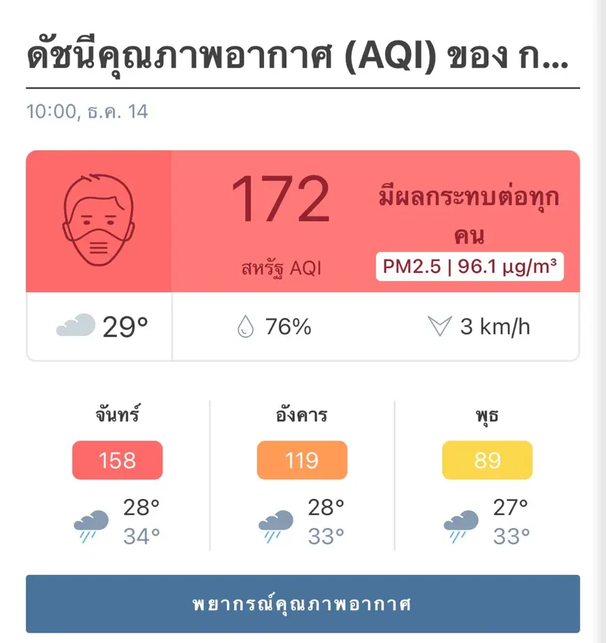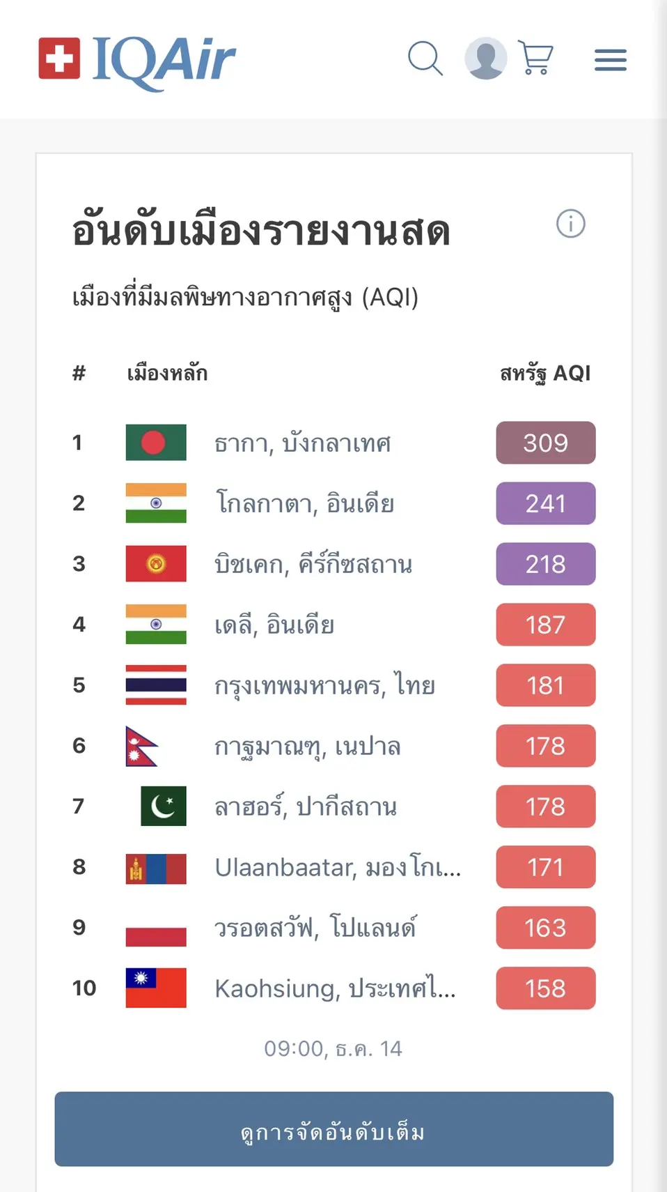 เว็บไซต์ airvisual.com เผยการจัดอันดับคุณภาพอากาศและการจัดอันดับเมืองที่มีมลพิษ ตามมาตรฐาน US AQI เมื่อเวลา 08.00 น. พบว่า อันดับ 1 ได้แก่ ธากา บังกลาเทศ อันดับ 2 โกลกาตา อินเดีย อันดับ 3 บิชเคก คีร์กีซสถาน ส่วน กรุงเทพฯ ประเทศไทย อยู่ที่อันดับ 5 ของโลก