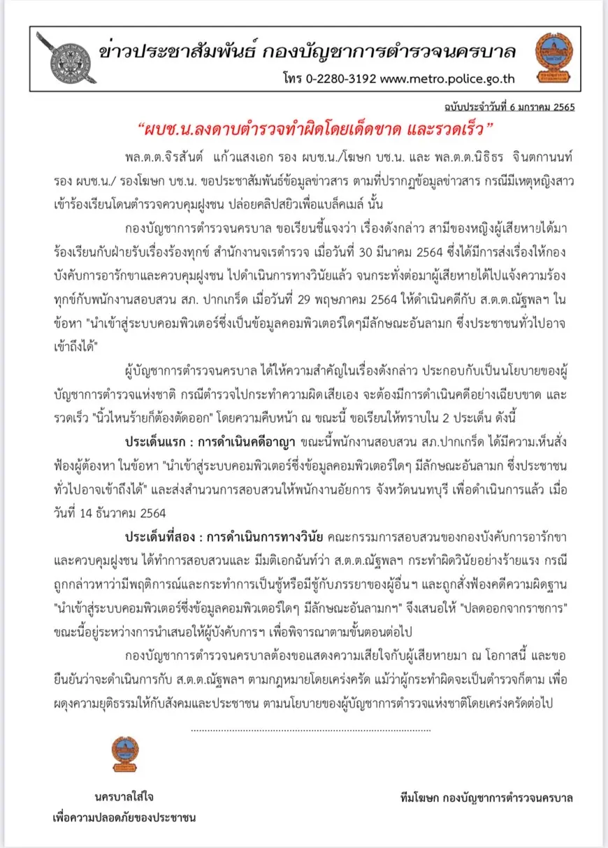 ผู้บัญชาการตำรวจนครบาล ได้ให้ความสำคัญในเรื่องดังกล่าว ประกอบกับเป็นนโยบายของผู้บัญชาการตำรวจแห่งชาติ กรณีตำรวจไปกระทำความผิด เสียเอง จะต้องมีการดำเนินคดีอย่างเฉียบขาด และรวดเร็ว “นิ้วไหนร้ายก็ต้องตัดออก” โดยความคืบหน้า ณ ขณะนี้ ขอเรียนให้ทราบใน 2 ประเด็น ดังนี้