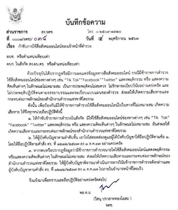 ตำรวจ — พล.ต.อ.วิสนุ ปราสาททองโอสถ จเรตำรวจแห่งชาติ บันทึกข้อความเรื่อง กำชับการใช้สื่อสังคมออนไลน์ของเจ้าหน้าที่ตำรวจ