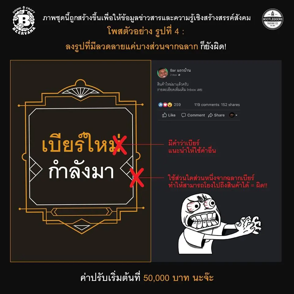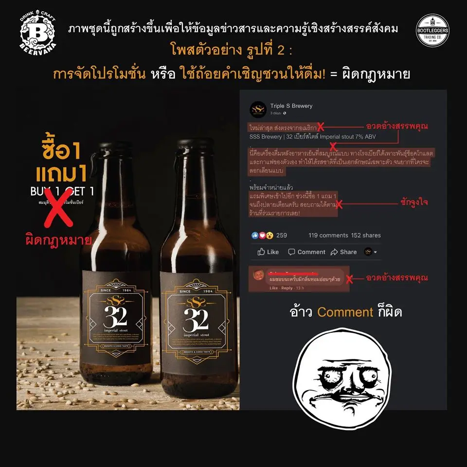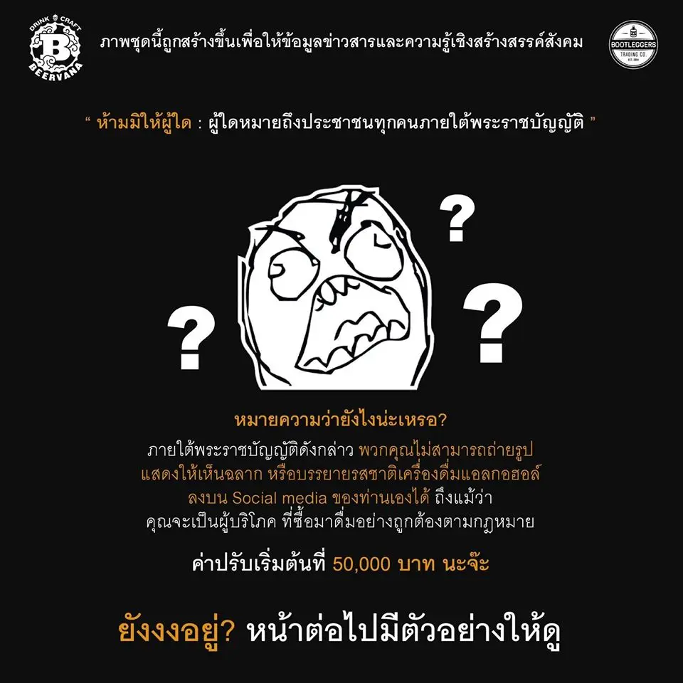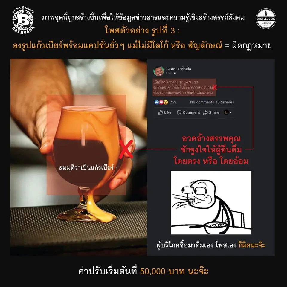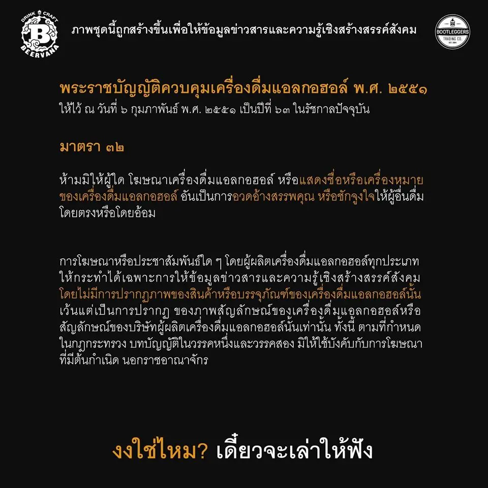 เฟซบุ๊กเพจ Beervana Thailand ผู้จัดจำหน่ายเบียร์คราฟท์รายหนึ่ง ได้โพสต์ข้อความให้ความรู้เกี่ยวกับข้อห้ามต่างๆ ของมาตรา 32 ของพระราชบัญญัติ (พ.ร.บ.) ควบคุมเครื่องดื่มแอลกอฮอล์ พ.ศ. 2551 โดยระบุว่า