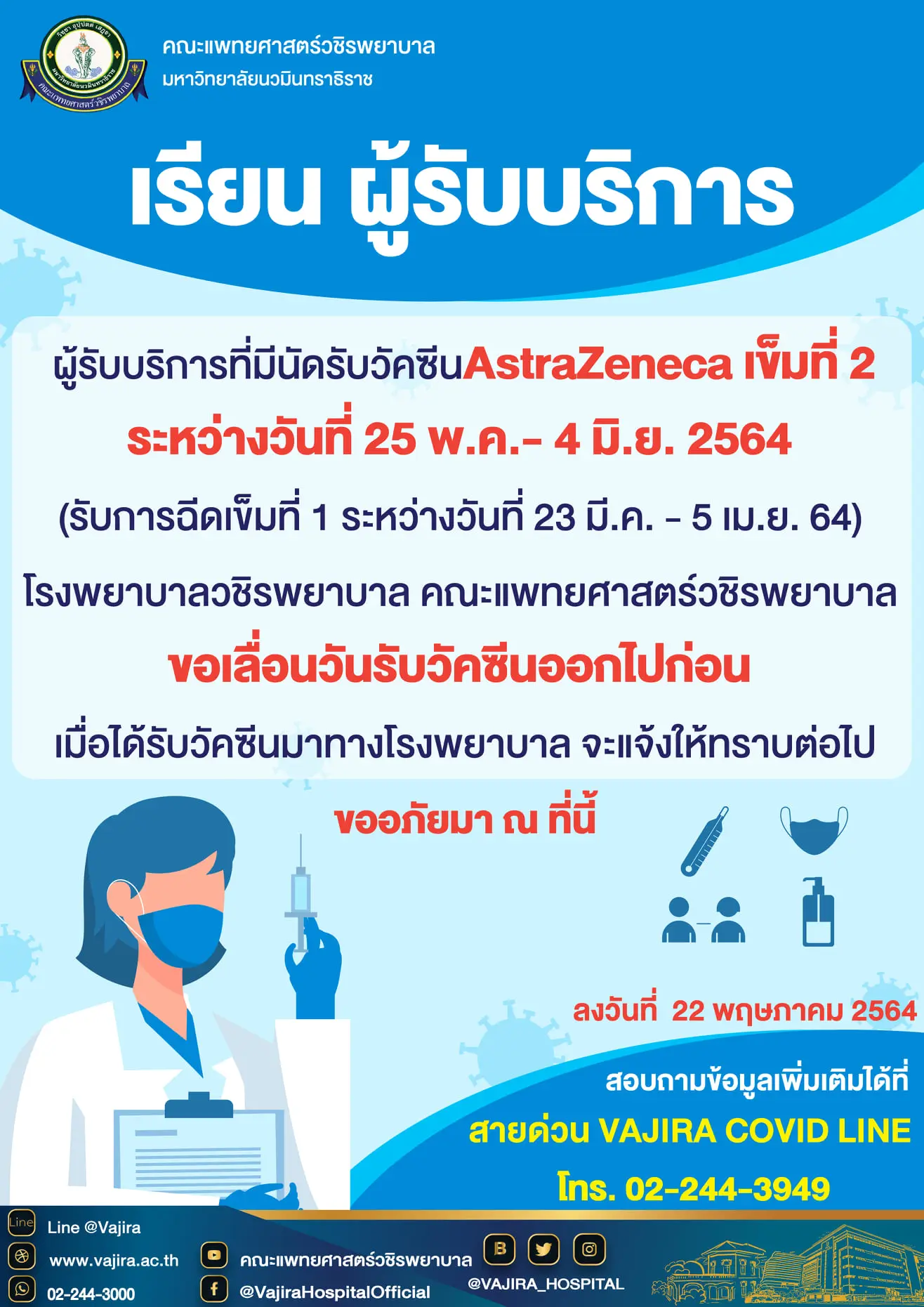 “เรียน ผู้รับบริการที่มีนัดรับวัคซีน AstraZeneca เข็มที่ 2 ระหว่างวันที่ 25 พ.ค.- 4 มิ.ย. 2564 (รับการฉีดเข็มที่ 1 ระหว่างวันที่ 23 มี.ค. – 5 เม.ย. 64) โรงพยาบาลวชิรพยาบาล คณะแพทยศาสตร์วชิรพยาบาล ขอเลื่อนวันรับวัคซีนออกไปก่อน เมื่อได้รับวัคซีนมาทางโรงพยาบาล จะแจ้งให้ทราบต่อไป ขออภัยมา ณ ที่นี้”