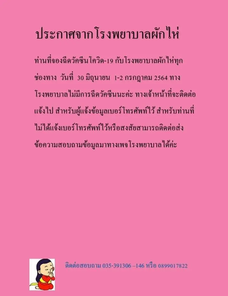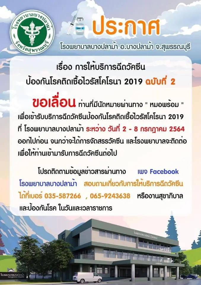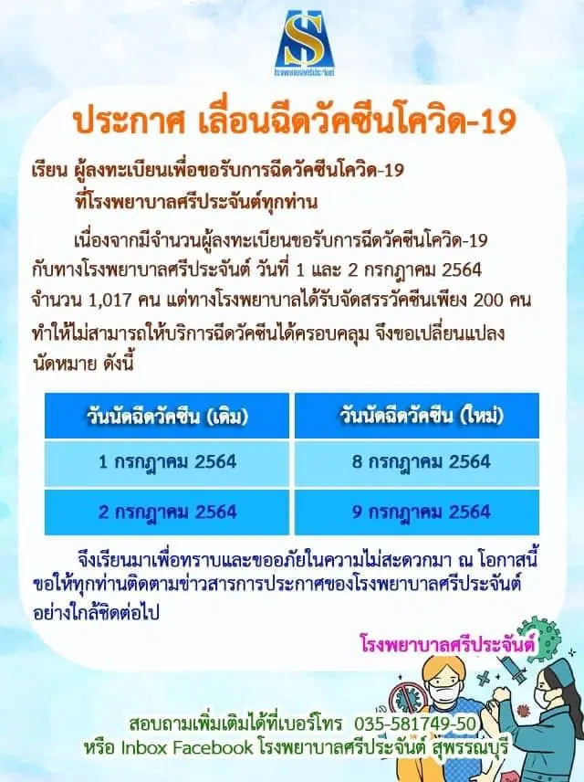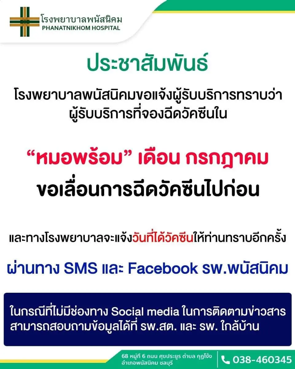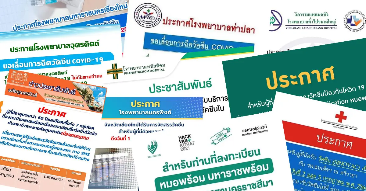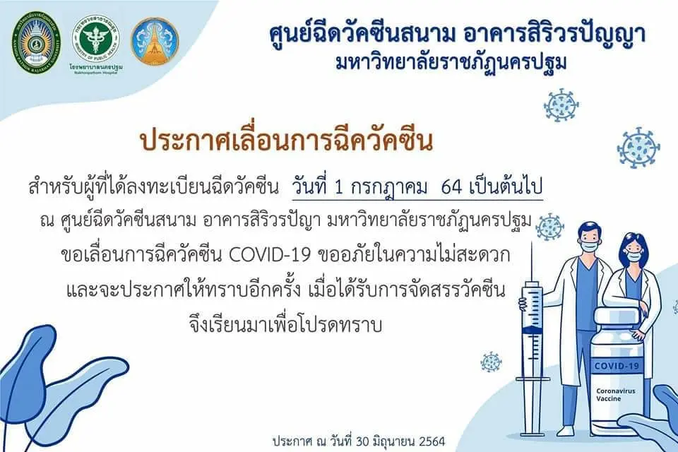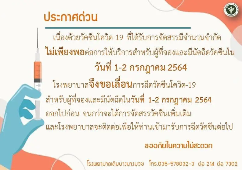 เช็กที่นี่! รวบรวมรพ.ประกาศ “เลื่อนฉีดวัคซีน” คิวฉีดเดือนกรกฏาคม อย่างไม่มีกำหนด จะแจ้งให้ทราบอีกครั้งหลังจากที่ได้รับการจัดสรรวัคซีน