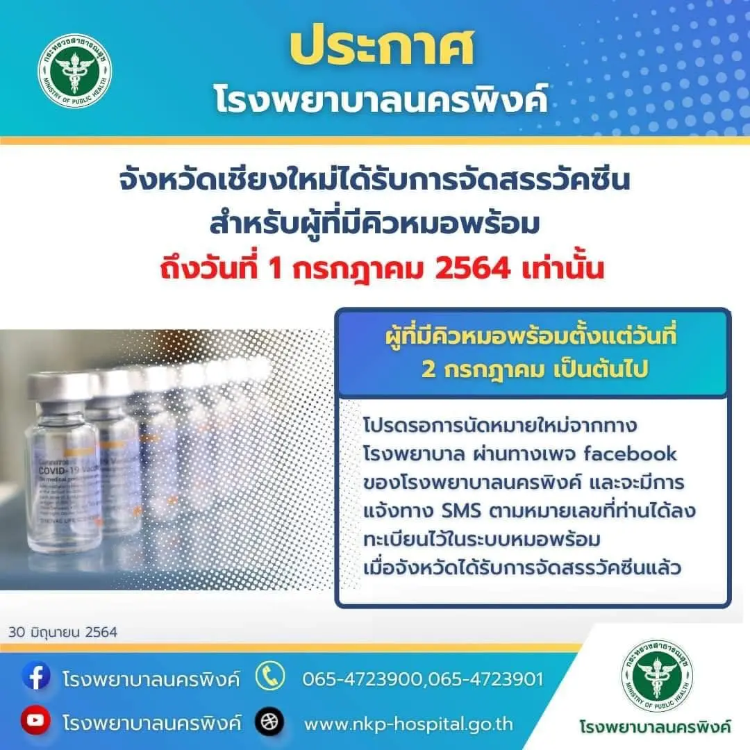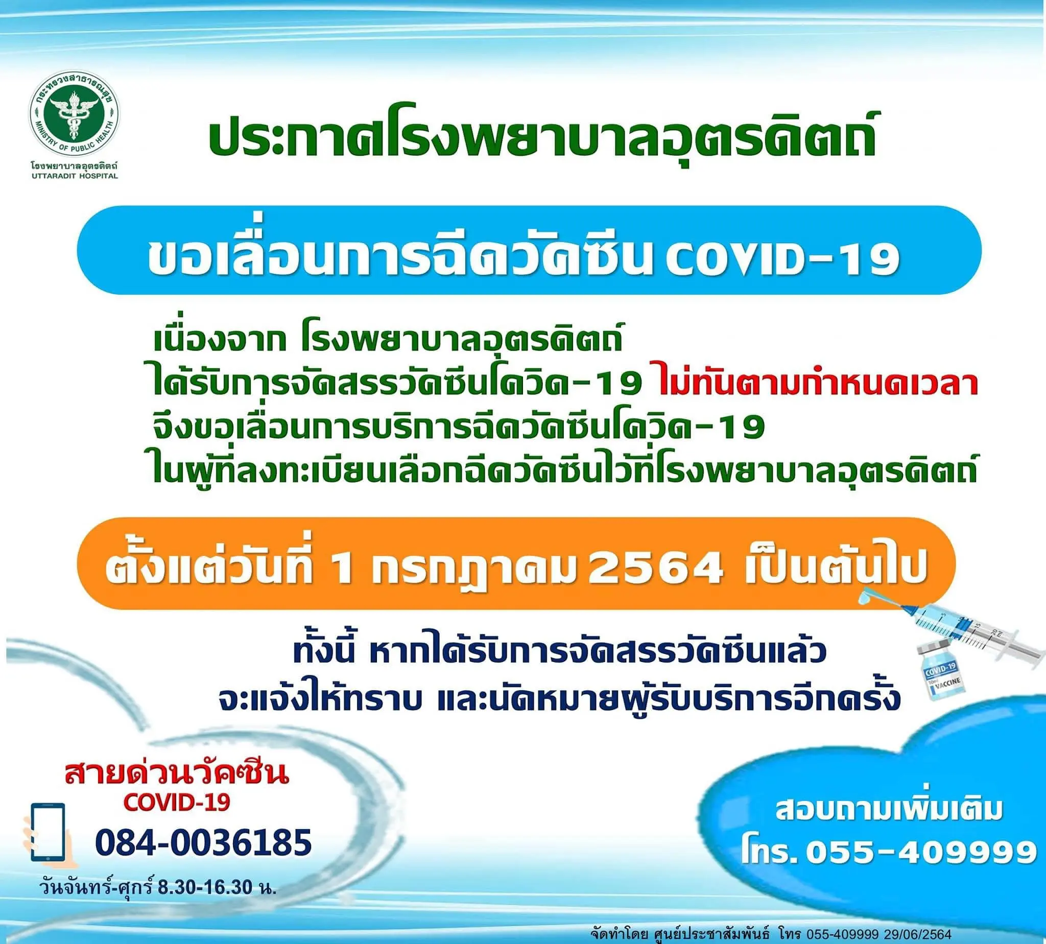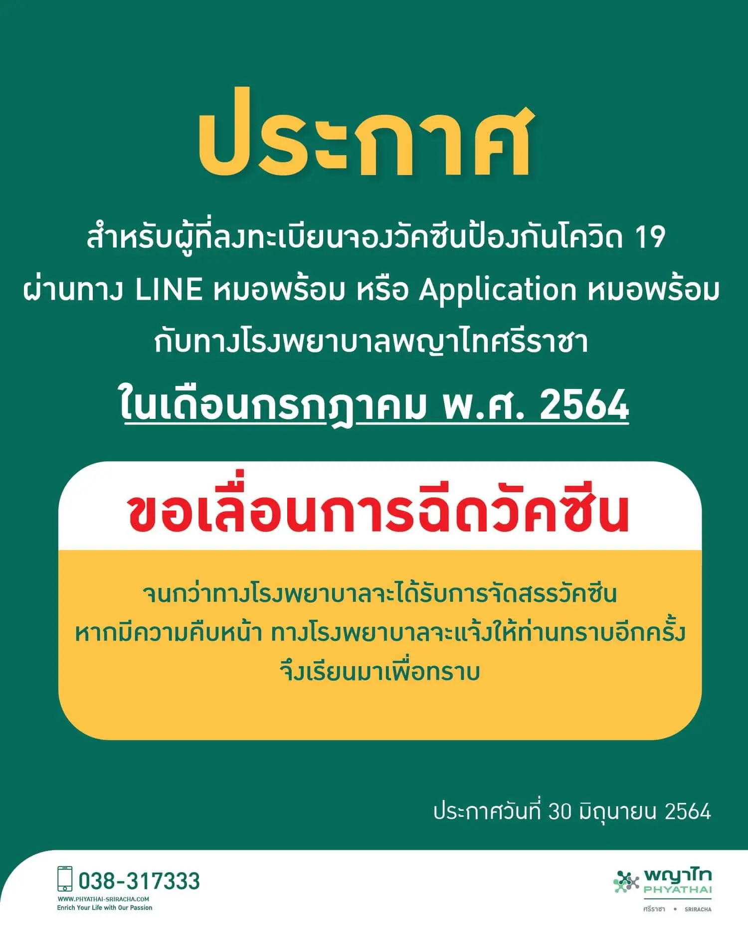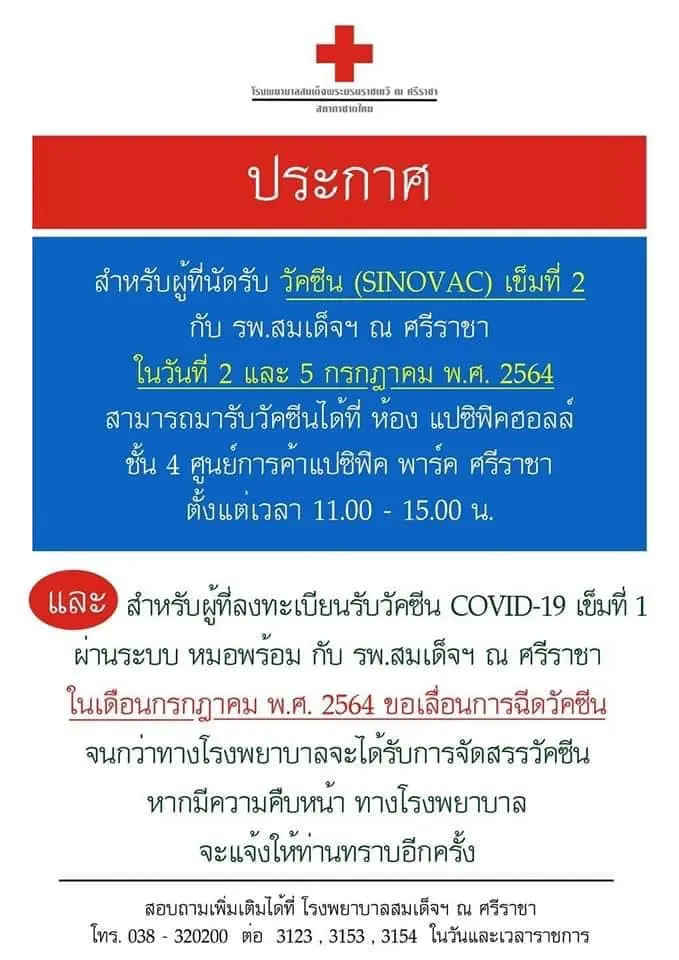 เช็กที่นี่! รวบรวมรพ.ประกาศ “เลื่อนฉีดวัคซีน” คิวฉีดเดือนกรกฏาคม อย่างไม่มีกำหนด จะแจ้งให้ทราบอีกครั้งหลังจากที่ได้รับการจัดสรรวัคซีน