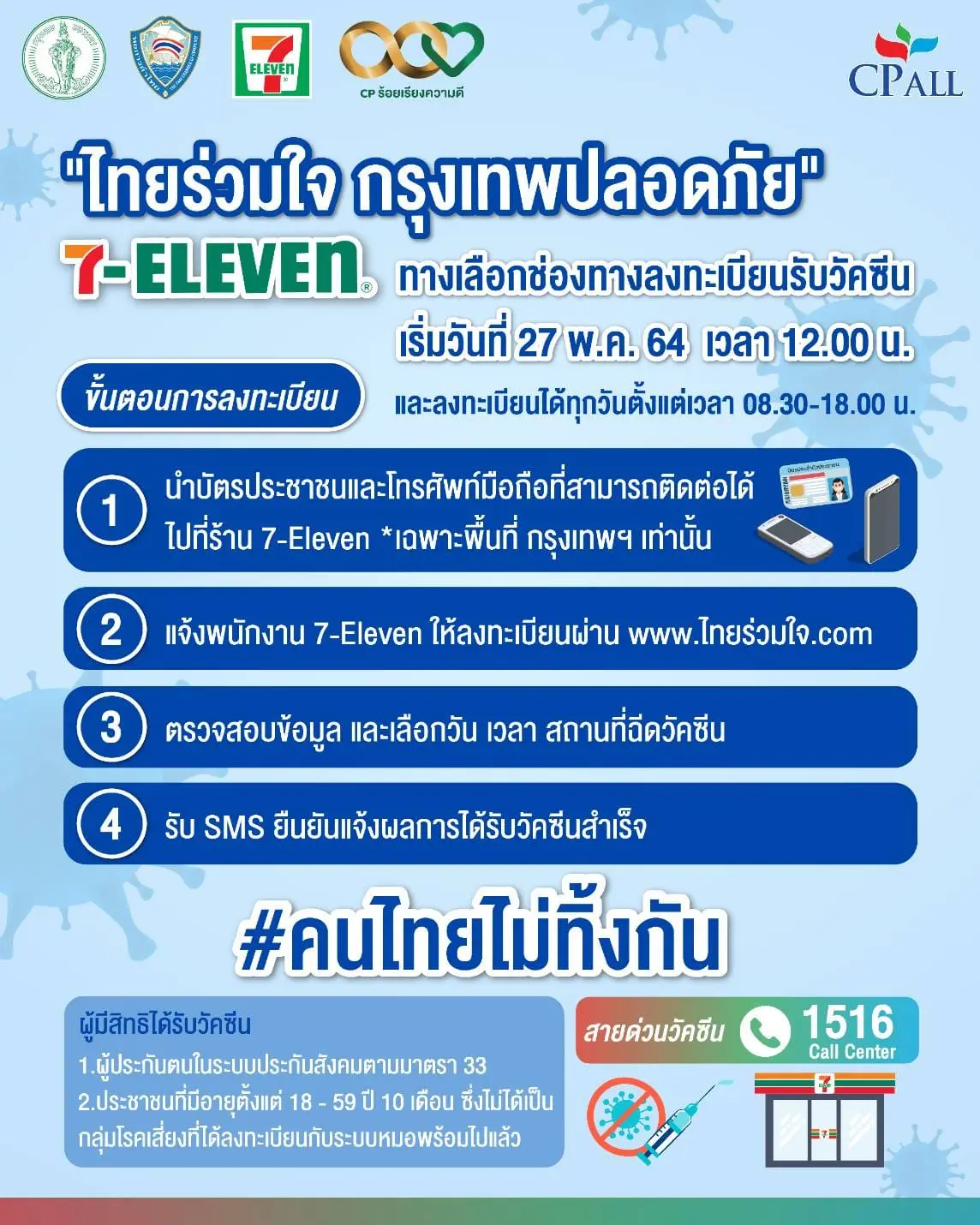 เมื่อวันที่ 26 พ.ค. เฟซบุ๊กเพจ CPALL ได้โพสต์ประกาศเตรียมเปิดรับลงทะเบียนจองฉีดวัคซีนโควิด19 โดยทางเซเว่นได้เตรียมพร้อมทั้งพนักงานที่จะให้คำแนะนำและช่วยเหลือ ตลอดจนอุปกรณ์ที่ร้านเซเว่น อีเลฟเว่นทั้ง 3,314 สาขาในพื้นที่กรุงเทพมหานครเป็นจุดบริการในการรับลงทะเบียนจองวัคซีนโควิด-19 เป็นที่เรียบร้อยแล้ว เพื่ออำนวยความสะดวกให้ประชาชนทันทีที่ระบบเปิดให้สามารถลงทะเบียนได้ในวันที่ 27 พฤษภาคม ตั้งแต่เวลา 12.00 น. เป็นต้นไป