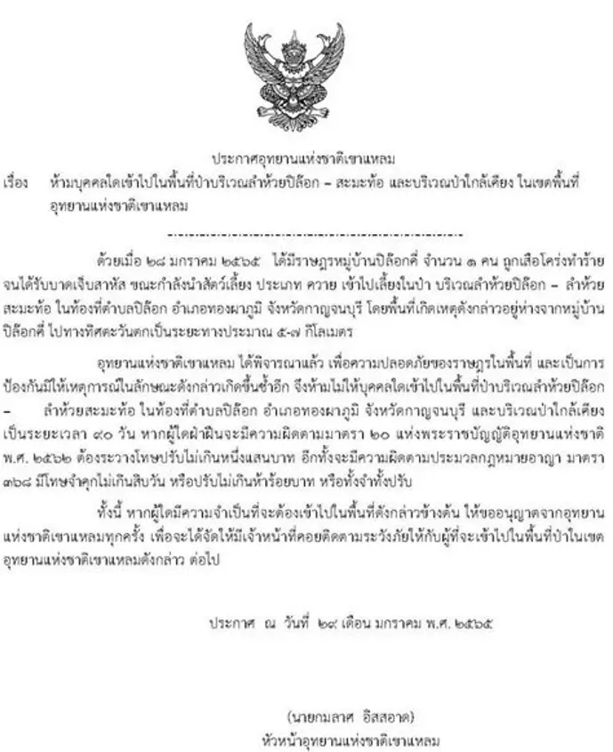 ป้องกัน เสือโคร่งกัด ! หัวหน้าอุทยานแห่งชาติเขาแหลม ออกประกาศห้ามบุคคลใดเข้าในพื้นที่ป่าลำห้วยปิล๊อก-สะมะท้อ และบริเวณป่าใกล้เคียง ในเขตพื้นที่อุทยานแห่งชาติเขาแหลม