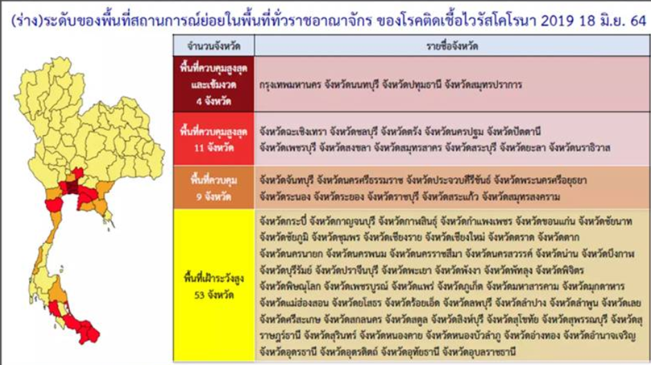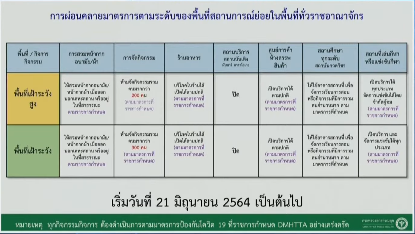 ข้อมูลจากการแถลงของ ศบค. มาตรการผ่อนคลายพื้นที่ควบคุมทั่วประเทศ เริ่มบังคับใช้ในวันที่ 21 มิถุนายน 2564 ส่วนสถานบันเทิงยังสั่งปิดทุกพื้นที่