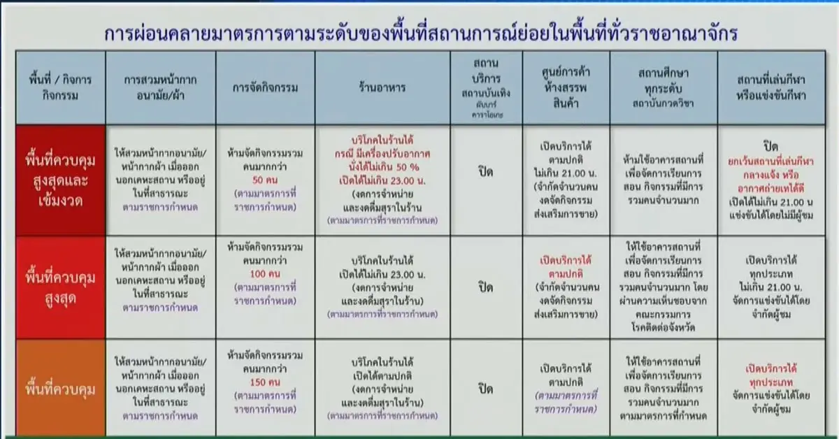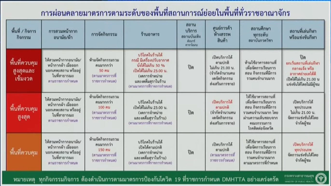 ทั้งนี้ทางศบค. เผยข้อมูลผ่อนคลายมาตรการพื้นที่สถานการณ์ย่อยใยพื้นที่ทั่วราชอาณาจักร โดยแบ่งพื้นที่ควบคุมออกเป็น 5 พื้นที่ ตามสถานการณ์การแพร่ระบาดของเชื้อโควิด-19 ในจังหวัดนั้นๆ ในส่วนของสถานบันเทิงและสถานบริการยังคงสั่งให้ปิดบริการในทุกพื้นที่ทั่วประเทศ การจัดกิจกรรมต่างๆ จะจำกัดจำนวนคนคนเข้าร่วม ส่วนห้างสรรพสินค้าสามารถเปิดทำการได้ปกติ ตามมาตรการและในเวลาที่กำหมด