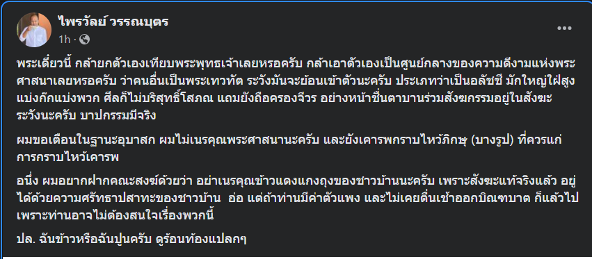 ล่าสุด ไพรวัลย์ วรรณบุตร หรือ ทิดไพรวัลย์ได้โพสต์เฟซบุ๊ก แสดงความคิดเห็นในเรื่องดังกล่าวว่า “พระเดี๋ยวนี้ กล้ายกตัวเองเทียบพระพุทธเจ้าเลยเหรอครับ กล้าเอาตัวเองเป็นศูนย์กลางของความดีงามแห่งพระศาสนาเลยเหรอครับ ว่าคนอื่นเป็นพระเทวทัต ระวังมันจะย้อนเข้าตัวนะครับ ประเภทว่าเป็นอลัชชี มักใหญ่ใฝ่สูง แบ่งก๊กแบ่งพวก ศีลก็ไม่บริสุทธิ์โสภณ แถมยังถือครองจีวร อย่างหน้าชื่นตาบานร่วมสังฆกรรมอยู่ในสังฆะ ระวังนะครับ บาปกรรมมีจริง