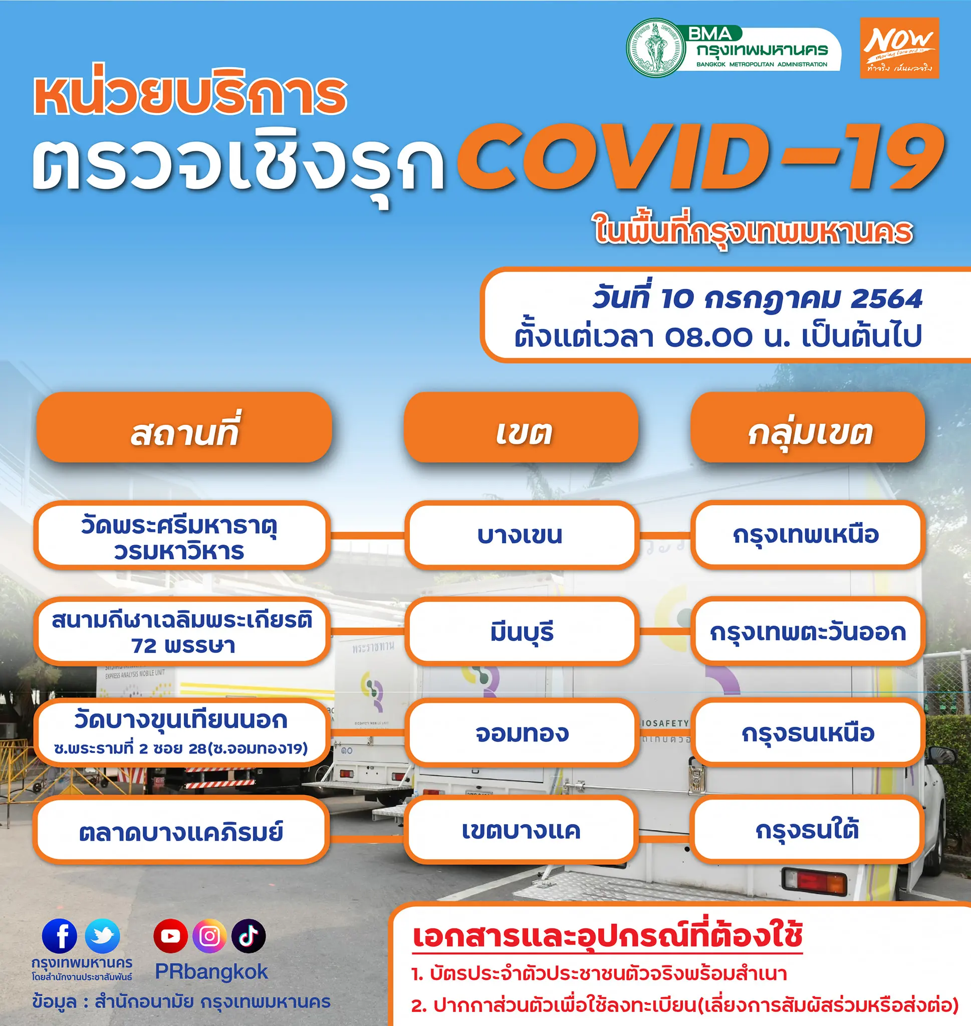 วันที่ 9 กรกฎาคม 2564 แฟนเพจ กรุงเทพมหานคร โดยสำนักงานประชาสัมพันธ์ เปิดเผยจุดตั้ง หน่วยบริการตรวจเชิงรุก COVID-19 ในพื้นที่กรุงเทพมหานคร ประจำวันที่ 10 ก.ค. 64 โดยจะให้บริการตั้งแต่เวลา 08.00 น. เป็นต้นไป