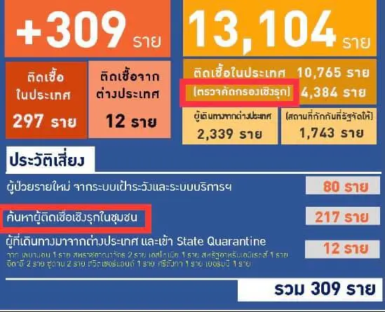 ตั้งแต่วันที่ 17 ธ.ค.ปีที่แล้ว คนที่ติดเชื้อจากการค้นหาเชิงรุกทั้งหมดพบ 4,384 ราย ตัวเลขนี้น่าจะต่ำกว่าความเป็นจริงมากเพราะการตรวจเชิงรุกทำได้ค่อนข้างจำกัดเนื่องจากขาดแคลนงบประมาณ เจ้าหน้าที่ เครื่องมือ และห้องปฏิบัติการ เชื่อว่าแรงงานต่างชาติจะติดเชื้อต่อไปเรื่อยๆ ถ้ายังไม่ได้รับการฉีดวัคซีน จนกว่าแรงงานต่างชาติมากถึงร้อยละ 70 ติดเชื้อ เกิดภูมิคุ้มกันหมู่ การระบาดในแรงงานต่างชาติถึงจะยุติ นั่นหมายถึงต้องใช้เวลาอีกอย่างน้อย 6 เดือน ความหวังที่ประเทศไทยจะควบคุมตัวเลขคนติดเชื้อในประเทศให้เป็นศูนย์นับร้อยวันเหมือนการระบาดรอบแรกคงเป็นไปไม่ได้