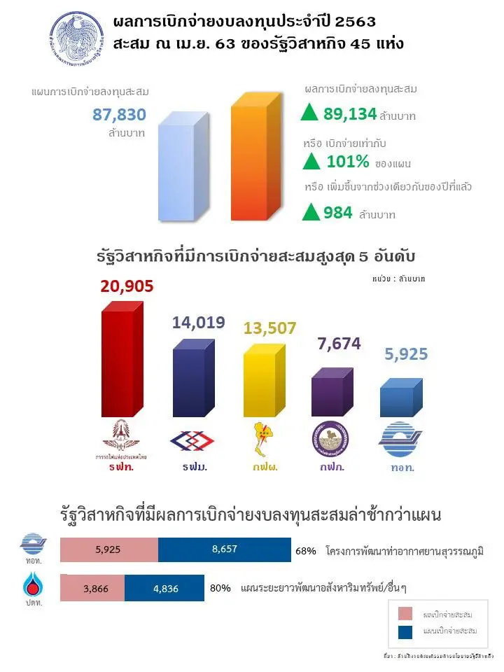 นางสาวปิยวรรณ ล่ามกิจจา รองผู้อำนวยการ สคร. รักษาการในตำแหน่งที่ปรึกษาด้านพัฒนารัฐวิสาหกิจ กล่าวเพิ่มเติมว่า ผลการเบิกจ่ายงบลงทุนสะสมของรัฐวิสาหกิจ 45 แห่ง แบ่งเป็นการเบิกจ่ายของรัฐวิสาหกิจปีงบประมาณ 34 แห่ง จำนวน 55,640 ล้านบาท หรือคิดเป็นร้อยละ 98 ของแผนการเบิกจ่ายงบลงทุนสะสม 7 เดือน (ตั้งแต่เดือนตุลาคม 2562 – เมษายน 2563) และการเบิกจ่ายของรัฐวิสาหกิจปีปฏิทิน 11 แห่ง จำนวน 33,494 ล้านบาท หรือคิดเป็นร้อยละ 108 ของแผนการเบิกจ่ายงบลงทุนสะสม 4 เดือน (ตั้งแต่เดือนมกราคม – เมษายน 2563)