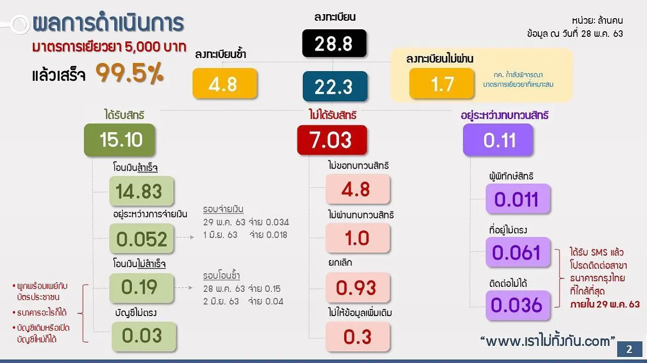 www.เราไม่ทิ้งกัน.com ในช่วงเดือนสุดท้าย มิถุนายน ผู้ผ่านเกณฑ์โครงการมาตรการเยียวยาประชาชนที่ได้รับผลกระทบจาก โควิด19 เป็นเงิน 5,000 บาท นาน 3 เดือน (เมย.-มิย. 63) โดยมีตัวเลขคือผู้ได้รับสิทธิ์ 15.10 ล้านคน