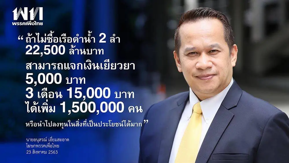 กรณีเงินเยียวยา www.เราไม่ทิ้งกัน.com วานนี้ 23 สิงหาคม 2563 นาย อนุสรณ์ เอี่ยมสะอาด โฆษกพรรคเพื่อไทย กล่าวถึงกรณีคณะอนุกรรมาธิการ (กมธ.) ครุภัณฑ์ ไอซีที รัฐวิสาหกิจและทุนหมุนเวียน ในคณะ กมธ. วิสามัญพิจารณาร่าง พ.ร.บ.งบประมาณรายจ่ายประจำปีงบประมาณ 2564 มีมติเสียงข้างมาก 5 ต่อ 4 ผ่านงบฯจัดซื้อเรือดำน้ำของกองทัพเรือ 2 ลำ วงเงิน 22,500 ล้านบาท ว่า นายกรัฐมนตรีจะท่องคาถาไม่เกี่ยว ลอยตัวหนีปัญหา โบ้ยเป็นความผิดของกองทัพไม่ได้