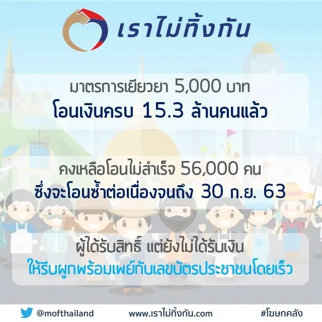 โดยคงเหลือผู้ที่ยังโอนเงินไม่สำเร็จจำนวนประมาณ 56,000 คน ซึ่งกระทรวงการคลังจะดำเนินการโอนเงินซ้ำ (Retry) ต่อเนื่อง จนถึงวันที่ 30 กันยายน 2563 เท่านั้น เพื่อให้สอดคล้องกับมติคณะรัฐมนตรีเมื่อวันที่ 18 สิงหาคม 2563 ดังนั้น สำหรับผู้มีสิทธิ์แต่ยังไม่ได้รับเงิน ขอให้ตรวจสอบว่าท่านอยู่ในกลุ่มผู้มีสิทธิ์ที่กระทรวงการคลังโอนเงินไม่สำเร็จหรือไม่ โดยตรวจสอบผ่านเว็บไซต์ www. เราไม่ทิ้งกัน. com ปุ่มสีเขียวเข้ม “ผู้มีสิทธิ์ที่ยังโอนเงินไม่สำเร็จ” ทั้งนี้ หากท่านอยู่ในกลุ่มดังกล่าว หรือท่านได้รับข้อความ SMS แจ้งว่าเป็นผู้มีสิทธิ์แต่โอนเงินไม่สำเร็จ ขอให้รีบไปติดต่อธนาคารใดก็ได้ที่ท่านมีบัญชีอยู่ และดำเนินการผูกพร้อมเพย์ด้วยเลขบัตรประชาชนโดยเร็ว ก่อนวันที่ 28 กันยายน 2563 เพื่อให้สามารถรับเงินโอนจากกระทรวงการคลังได้ทันภายในวันที่ 30 กันยายน 2563