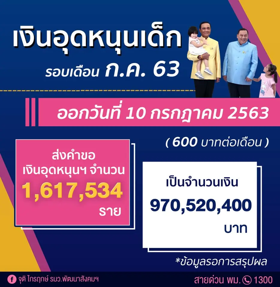 เงินออกวันที่ 10 กรกฏาคม 2563 / (600 บาทต่อเดือน) ส่งคำขอเงินอุดหนุนเด็ก จำนวน 1,617,534 ราย เป็นจำนวนเงิน 970,520,400 บาท