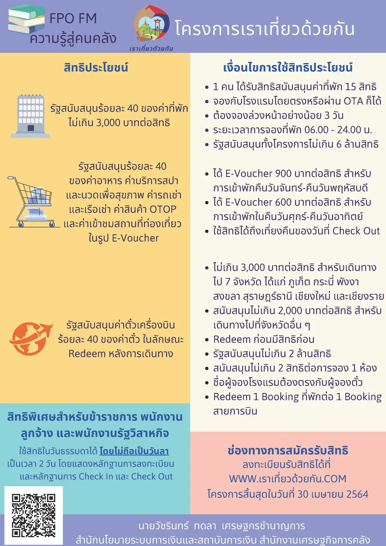 เราเที่ยวด้วยกัน — เพจเฟซบุ๊กสำนักงานเศรษฐกิจการคลัง : Fiscal Policy Office เผยข้อมูลเงื่อนไขการใช้สิทธิประโยชน์ สิทธิพิเศษสำหรับข้าราชการ พนักงาน ลูกจ้าง และพนักงานรัฐวิสาหกิจ โครงการเราเที่ยวด้วยกัน ดังนี้